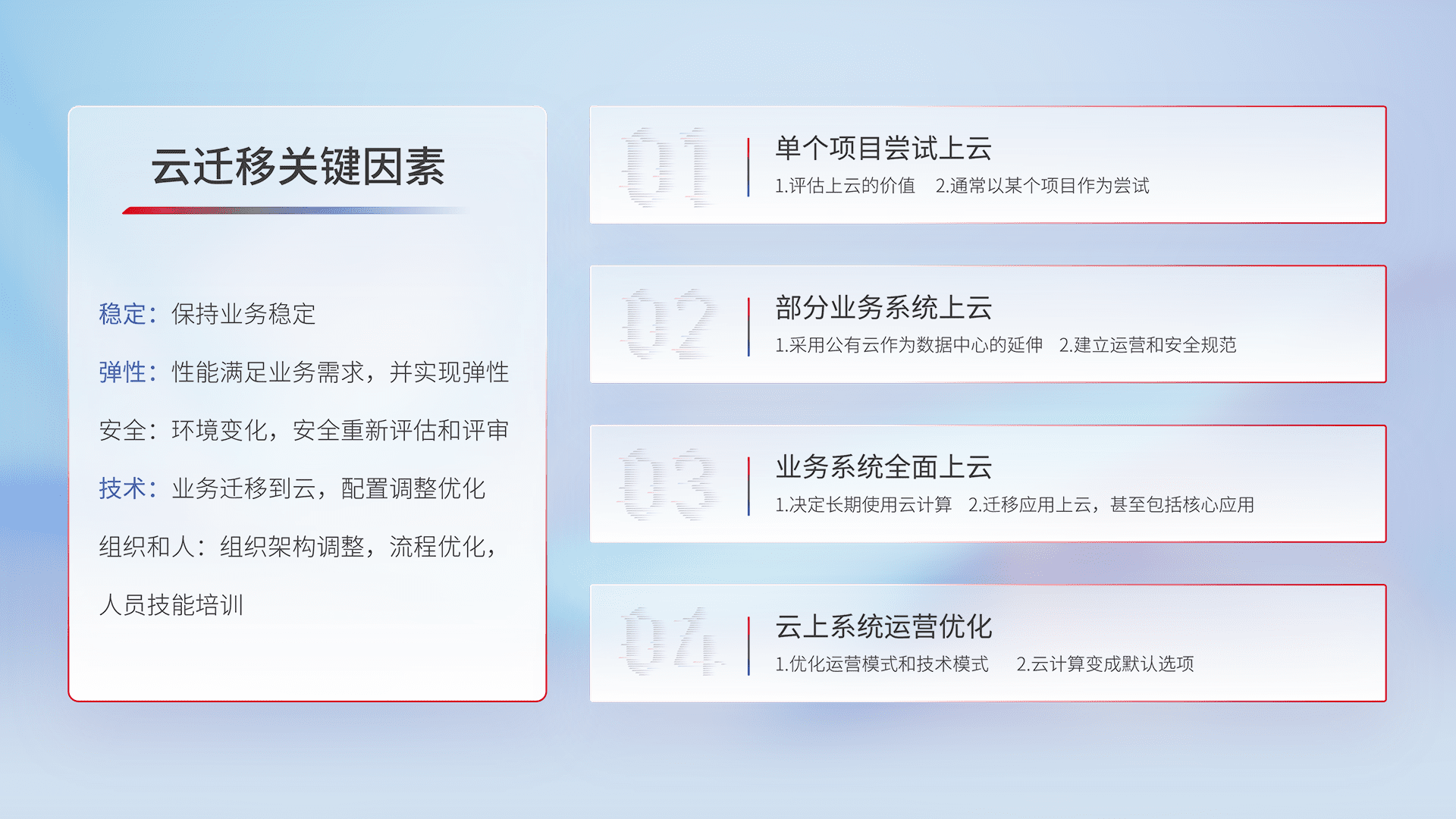结合实际业务,,,从规划设计、、、、云平台选型、、云原生改造、、数据迁移、、、、集成交付,,,,迁移全过程为客户识别最佳上云路径,,做好风险识别管理,,,设计网络架构、、、、身份权限、、、安全审计合规、、操作审计、、、、日志审计、、、、监控告警策略、、多站点容灾设计等,,,,对云上基础设施进行整体规划,,提升IT治理水平,,,,以满足弹性、、、、高可用、、、、高性能的需求。。。。