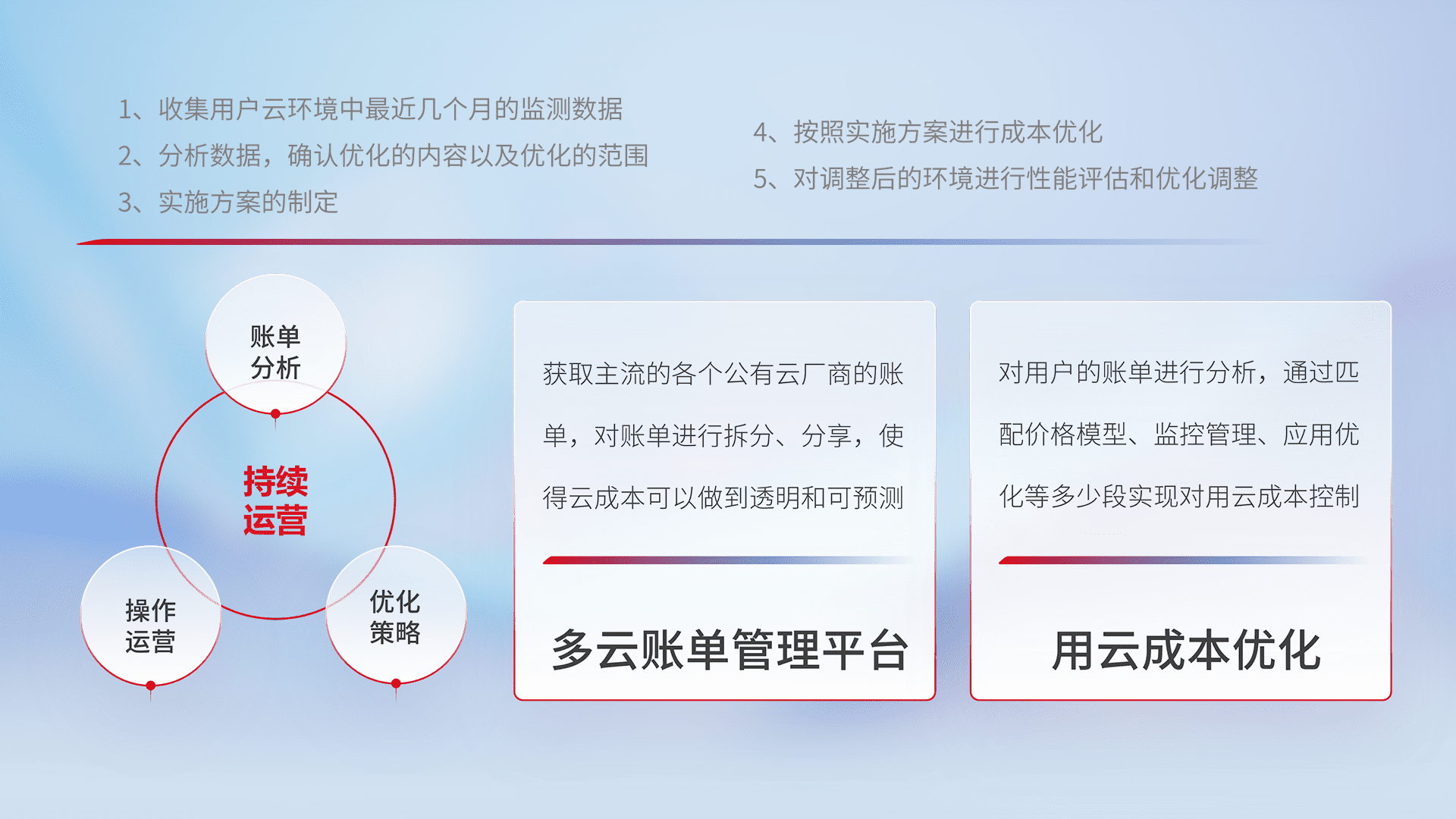 通过多云纳管,,,,以统一的资源数据模型把客户的云资源进行抽象和封装,,,进而实现对多云资源的统一操作,,,保障云资源管理的可靠性、、稳定性与可用性。。量身定制化运维内容,,,配置、、、开发运维、、、补丁管理、、、备份、、监控、、、、认证和访问管理、、、审计和日常巡检等,,保障在用云过程中的可靠度,,稳定度以及高可用率。。。